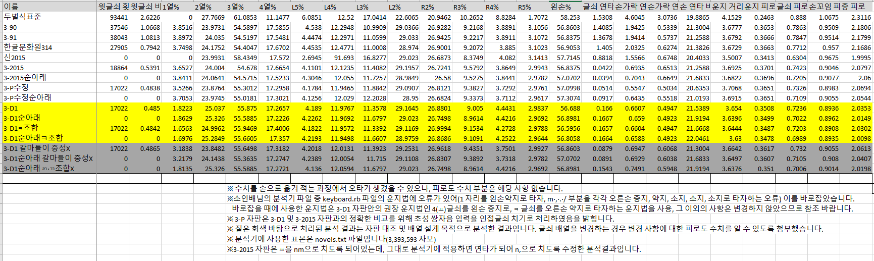 다음은 분석기에서 34만 자모 표본(novels.txt)으로 분석했을 때의 결괏값입니다. 소인배님의 분석기를 사용하였으며, 분석기의 운지도 설정값 중 nm,./ 부분이 각각 오른손 23455로 되어 있는 부분과(ㅎ+ㅅ→ㅆ를 적용하기 위한 설정값?) 1 자리를 왼손 약지로 타자하게 한 부분을 수정해서 분석한 값이니 착오 없으시길 바랍니다.