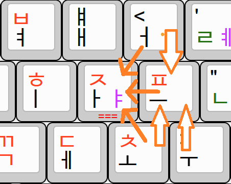 • 가운뎃소리 ㅛ는 중지로, 첫소리 ㅋ은 약지로 타자한다(표준 키보드 기준. 인체공학 자판을 이용하시는 경우 표준 타자법으로 타자하십시오).
