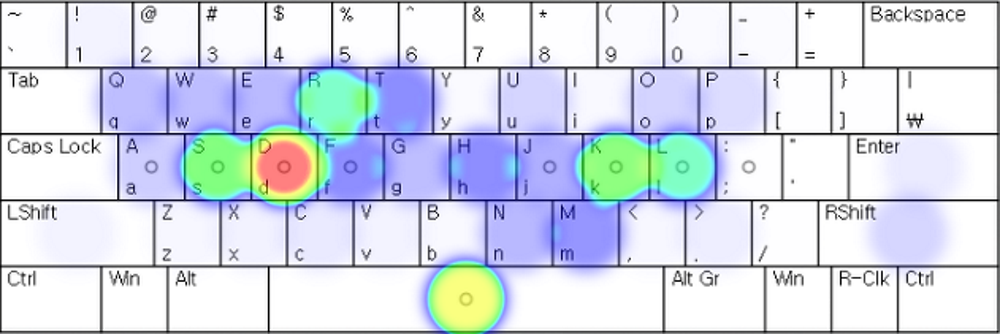 한글날 노래의 타자 행동을 빈도 분포로 나타내면 다음과 같습니다(쉬프트는 표시가 되어있지 않습니다).