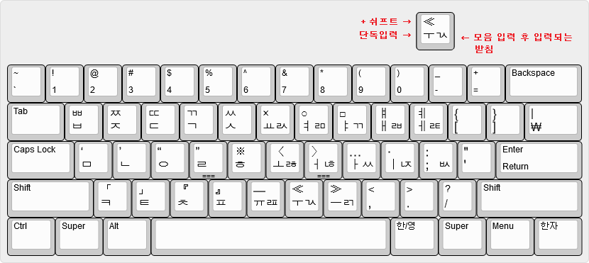 - 외워야 하는 글쇠 수가 많아 두벌식에 비해 익숙해지기 힘들다.