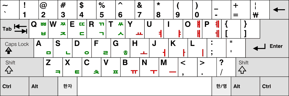 - 영문 쿼티 자판과 기호 배열이 동일하다.